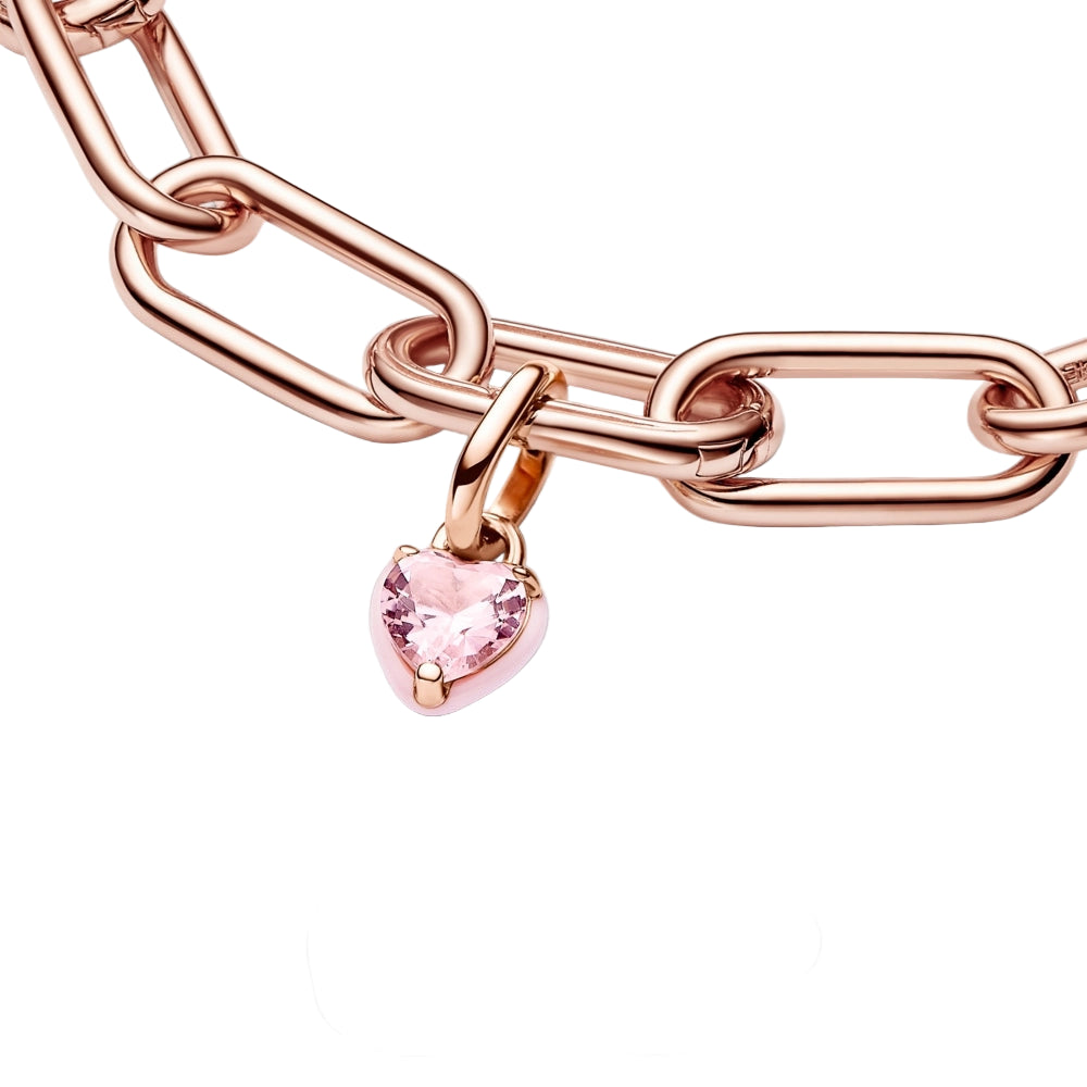 Love has no limits when you wear the ME Pink Chakra Heart Mini Dangle Charm. This 14k rose gold-plated charm features light pink hand-applied enamel and a pink heart-shaped man-made crystal at the centre. The reverse side features a 14k rose gold-plated polished heart with grooved lines and cut-out detailing. A reminder that wild hearts can't be broken, this mini dangle charm brings a depth to your look, symbolising that love – for yourself and others – always wins. Compatible with Pan ME and Pan Moments.
